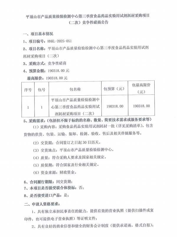 平顶山市产品质量检验检测中心第三季度食品药品实验用试剂耗材采购项目(二次)竞争性磋商公告